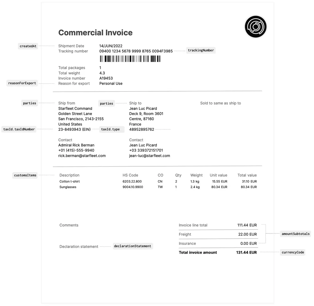 Here is an example of some of the variables in the API and how they combine to create a complete commercial invoice.
